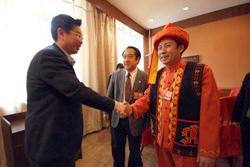 内江族人代表吉方云和重庆的潼南族人代表吉声聘亲切握手致谢