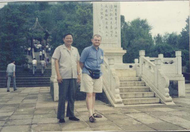 1992年8月3日,吉春(左)与法国龙乐恒博士在内蒙古王昭君诗碑前合影