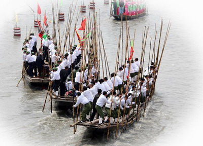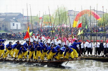 当天一大早,来自戴南、张郭、陈堡、边城、周庄、溱潼等10多个乡镇的300多条船会聚茅山镇西大河,各船鱼贯而行,集中到水面宽阔的河道竞渡。一时竹篙如林、百舸争流,河岸上彩旗飘扬,锣鼓喧天,数万观众欢声如潮。只见“篙子船”上的青壮年男子手持长篙,以锣声为律,在“扬锣手”的指挥下,动作一致,奋勇争先。在锣鼓声、呐喊声的助威下,一场秩序井然的竞渡混战拉开帷幕。撑船时,篙如弓形,前后两人左右脚相抵,以保证身体平衡,亮起嗓门齐喊:“下!下!”篙手两臂张开,两手挥动竹篙,笔直地两上两下,扬篙如长矛列阵,下篙似巨蟒入水,众篙像排剑一样戳向蓝天,竹篙与船帮相碰发出“笃笃”撞击声。竹篙在各船船员的手中有节奏地舞动,船也在水花四溅的河面上快速穿行。当锣声越来越紧时,下篙越密越劲,船将立刻从水面上腾起,犹如离弦之箭。顿时,水面上万朵浪花哗啦啦一齐绽开,千支竹篙像千支鼓锤,在茅山河的鼓面上敲击出惊天动地的鼓点;千支竹篙像千支彩笔,把水乡的天地描绘成色彩绚丽的美图。每当鸣鼓收兵时,各船船员则笔直地站在船的两侧,手中的篙子也成倒八字地指向空中,场面蔚为壮观。这是一种比团结、赛技巧、拼耐力的竞赛。